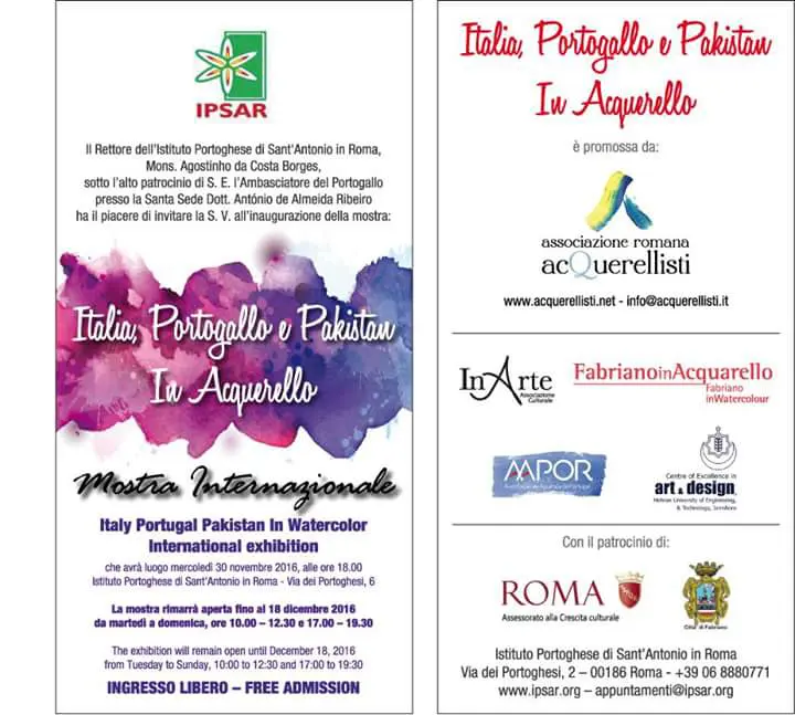 Felicissimo di far parte della mostra itinerante ITALY, PORTUGAL AND PAKISTAN INWATERCOLOR International Exhibition. Grazie ad Anna Massinissa ed InArte.